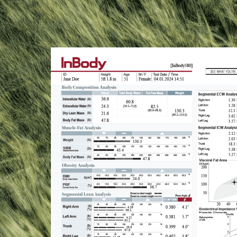 Go beyond the scale with the InBody Test, a non-invasive, quick, and accurate body composition analysis that provides a detailed breakdown of your weight in terms of muscle, fat, and water. No more pinching. No more dunking. Get results you can trust so you can reach your health and fitness goals with precision and actionable objectives.